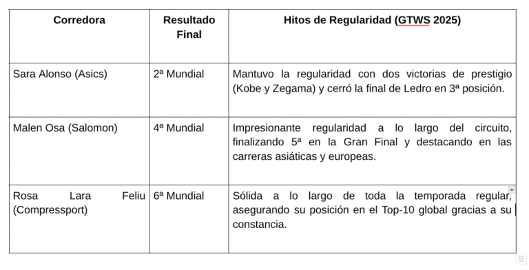 La presencia de tres atletas españolas entre las seis mejores del mundo es el mejor balance de la historia de las Golden Trail World Series, un hecho que consolida a España como una potencia global en el trail running de media distancia. Al 2º puesto de Sara Alonso ((Asics), hay que sumar la 4ª posición final de Malen Osa (Salomon) y la 6ª posición de Rosa Lara (Compressport).